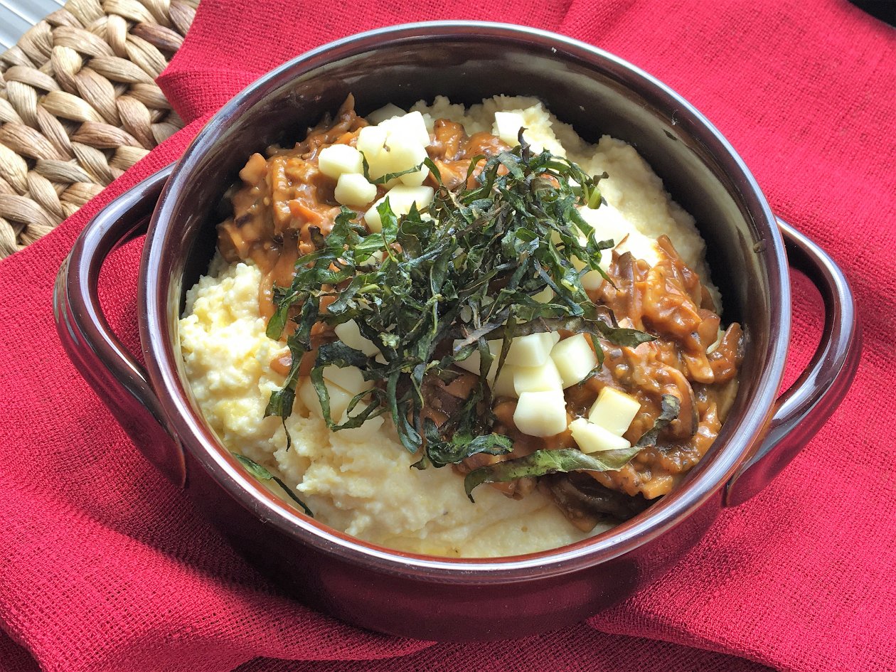 Mushroom Ragout with Creamy Polenta, Taleggio and Charred Greens